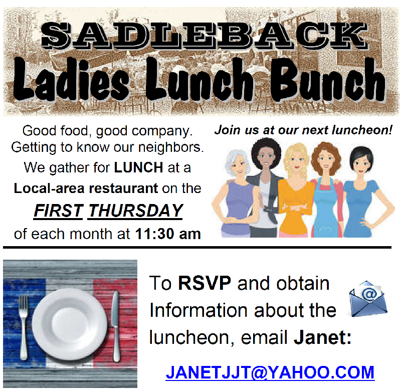 Ladies Luncheon Get to know your neighbors. We meet on the first Thursday of each month at 11:30. Contact Janet Johnson with questions at |